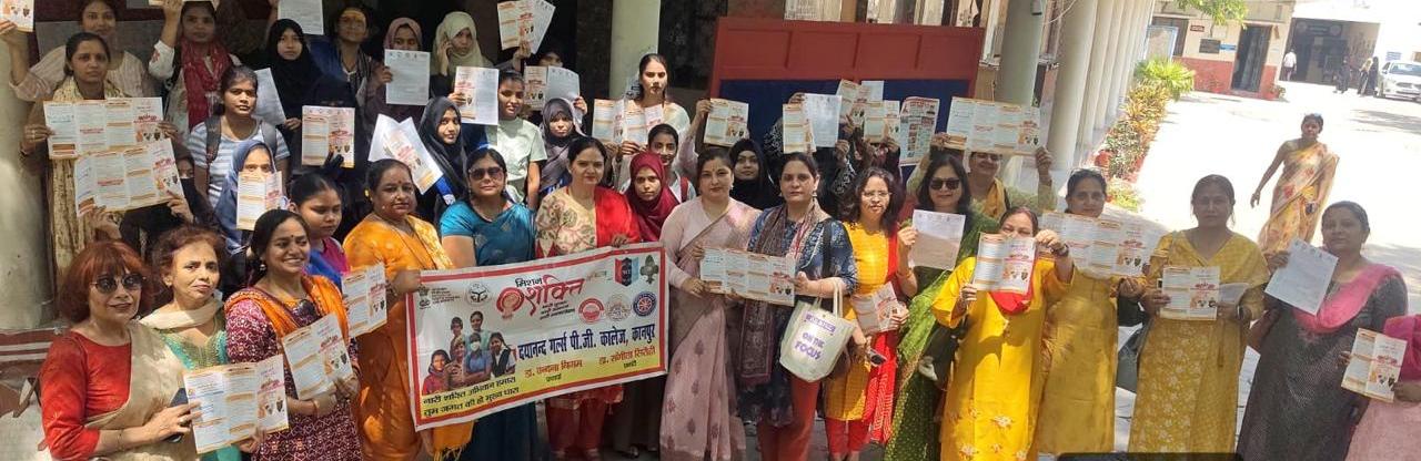 भारतीय स्वरूप संवाददाता कानपुर 9 अप्रैल राष्ट्रीय दयानंद गर्ल्स पी.जी. कॉलेज, कानपुर द्वारा गोद ली गई बस्ती लल्लन पुरवा, आजाद नगर में एक जागरूकता रैली का आयोजन किया गया।कार्यक्रम के दौरान महिलाओं एवं बालिकाओं को विभिन्न सरकारी कल्याणकारी योजनाओं की विस्तृत जानकारी प्रदान की गई। साथ ही उन्हें महिला सशक्तिकरण, सुरक्षा, शिक्षा एवं स्वास्थ्य से संबंधित योजनाओं के प्रति जागरूक किया गया। मिशन शक्ति कार्यक्रमों के उद्देश्यों एवं उनके लाभों के बारे में भी विस्तारपूर्वक जानकारी दी गई, जिससे महिलाएं अपने अधिकारों के प्रति सजग होकर आत्मनिर्भर बन सकें।इस अवसर पर 100 वॉलंटियर्स ने सक्रिय सहभागिता करते हुए बस्ती की महिलाओं से संवाद स्थापित किया और उन्हें योजनाओं का लाभ उठाने के लिए प्रेरित किया।