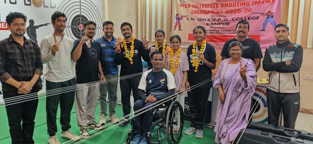 भारतीय स्वरूप संवाददाता कानपुर, दो दिवसीय छत्रपति शाहूजी महाराज विश्वविद्यालय अंतर महाविद्यालय शूटिंग प्रतियोगिता का आयोजन एसएन सेन बालिका विद्यालयपीजी कॉलेज द्वारा शूटिंग स्पोर्टस अकादमी ,कल्याणपुर में दिनांक 15 एवं 17अक्टूबर 2025 को आयोजित किया गया। कार्यक्रम का शुभारंभ प्राचार्य प्रो . सुमन द्वारा किया गया इस कार्यक्रम के मुख्य अतिथि मो . उमर वर्ल्ड कप शूटिंग के मेडलिस्ट को प्राचार्यों द्वारा मालार्यपण एवं स्मृति चिंह देकर सम्मानित किया गया ।| प्रतियोगिता महिला एव पुरुष दोनों वर्गों मेंआयोजित की गई जिसमें बढ़ चढ़कर खिलाड़ियों ने प्रतिभागिता दी। शूटिंग प्रतियोगिताओं के विभिन्न इवेंट में विजेता खिलाड़ियों के नाम निम्न वक्त हैं