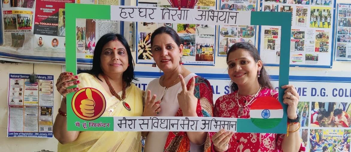भारतीय स्वरूप संवाददाता कानपुर 13 अगस्त दयानंद गर्ल्स पीजी कॉलेज कानपुर की राष्ट्रीय सेवा योजना इकाई , कार्यक्रम अधिकारी डॉ संगीता सिरोही के कुशल निर्देशन में छात्राओं के द्वारा “हर घर तिरंगा अभियान – 2025” द्वितीय चरण के अंतर्गत आयोजित “म्यूजिकल कंसर्ट एवं एच जी टी सेल्फी” गतिविधि में हिस्सा लिया गया। जिसमें छात्राओं के द्वारा स्वतंत्रता दिवस, तिरंगा आदि की थीम से संबंधित गानों का प्रस्तुतिकरण किया गया। इस कार्यक्रम में महाविद्यालय की 100 से अधिक छात्राएं उपस्थित रही तथा सभी ने उत्साह एवं उमंग के साथ हिस्सा लिया। कार्यक्रम को सफल बनाने में संगीत विभाग प्रभारी प्रो संगीता श्रीवास्तव, प्रो शालिनी त्रिपाठी, प्रो रुचिमिता पांडे, डॉ अलका सिंह, श्री निशांत कुमार सिंह समेत समस्त टीम का सहयोग सराहनीय रहा।