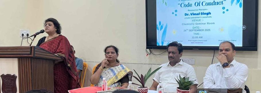 कार्यक्रम की शुरुआत प्रो सुजाता चतुर्वेदी(आईक्यूएसी संयोजक) के स्वागत भाषण से हुई। इसके बाद *प्राचार्य प्रो. विनय जॉन सेबेस्टियन* ने विद्यार्थियों को संबोधित करते हुए उच्च शिक्षा में अनुशासन और मूल्यों की महत्ता पर प्रकाश डाला।