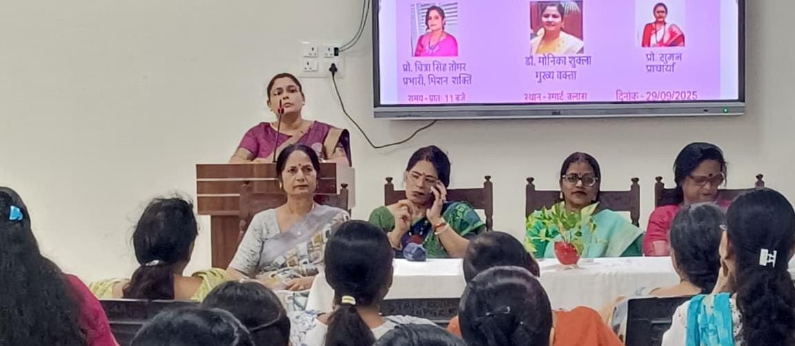 भारतीय स्वरूप संवाददाता कानपुर एस.एन. सेन बी.वी.पी.जी. कॉलेज में मिशन शक्ति 5.0 के अंतर्गत *’महिला स्वावलम्बन एवं महिला उद्यमिता’* पर एक व्याख्यान का आयोजन कराया गया। कार्यक्रम का शुभारंभ दीप प्रज्वलन एवं माँ सरस्वती की मूर्ति पर माल्यार्पण द्वारा किया गया। इसके पश्चात प्राचार्य प्रो. सुमन ने स्वागत संबोधन के साथ ही मिशन शक्ति 5.0 की श्रृंखला में कराए जा रहे कार्यक्रमों की सराहना की और कहा कि, शासन द्वारा चलाए जा रहे हैं मिशन शक्ति कार्यक्रमों की सफलता तभी है, जब वास्तविक रूप से बालिकाओं और महिलाओं में अपने अधिकारों, स्वास्थ्य और सुरक्षा संबंधित जागरूकता उत्पन्न हो।